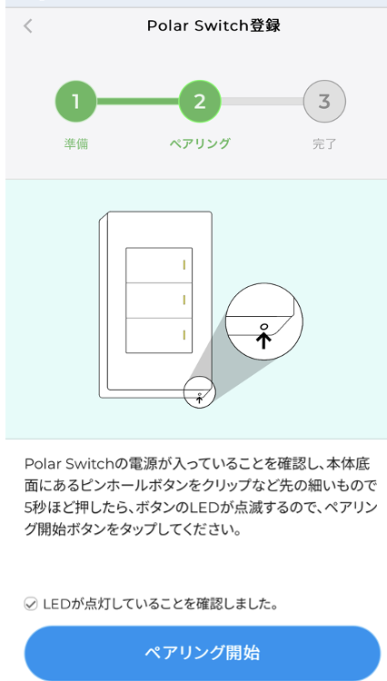 6. 本体底面にあるピンホールのボタンを、クリップなど先の細いもので5秒ほど押したら、LEDが点滅するので「ペアリング開始」をタップしてください。