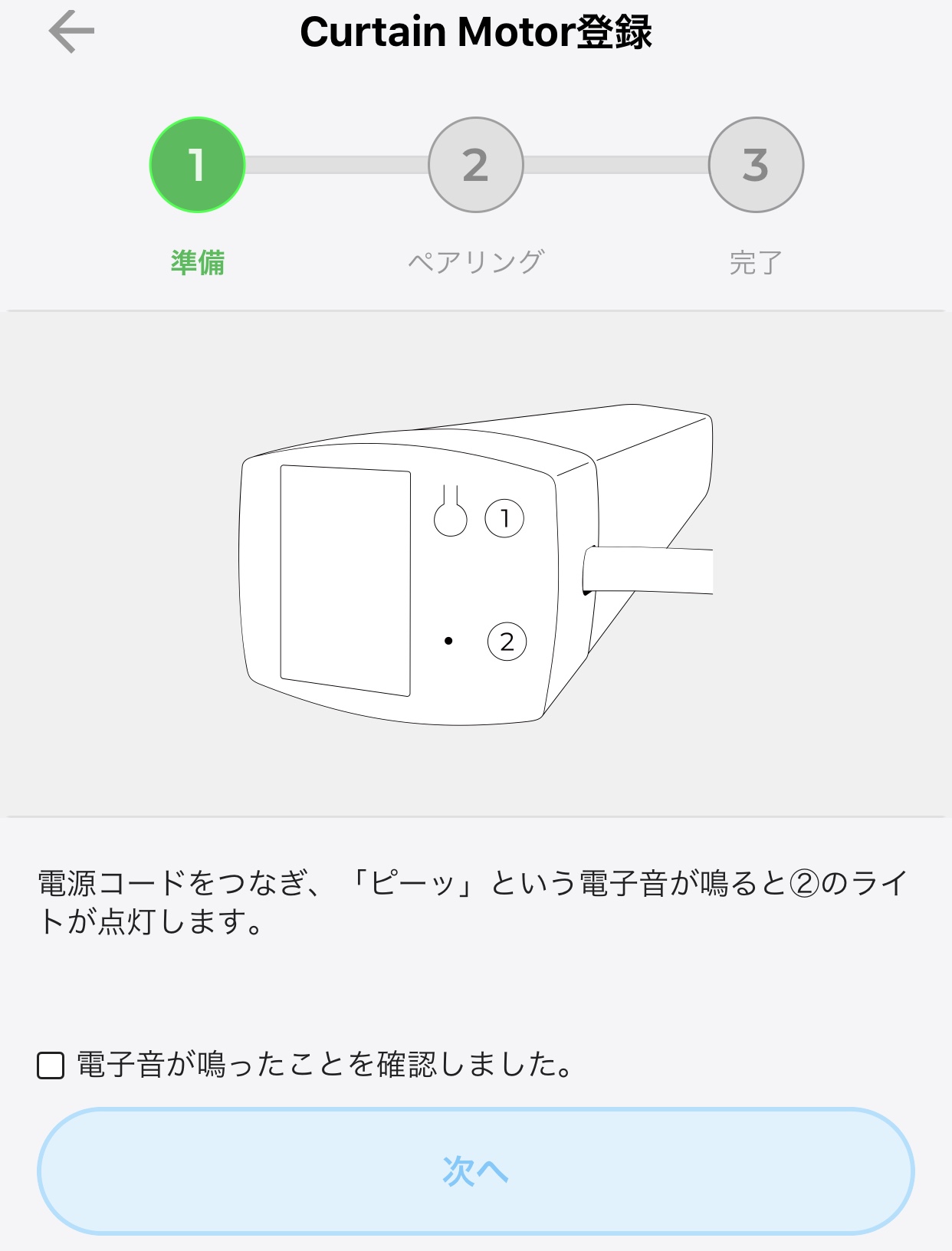 - Curtain Motorの電源コードをコンセントにつなぎ、「ピーッ」という電子音が鳴ったら②のライトが点灯したことを確認し、下記の画面の「電子音が鳴ったことを確認しました」にチェックボックスを選択してチェックを入れて「次へ」ボタンをタップします。