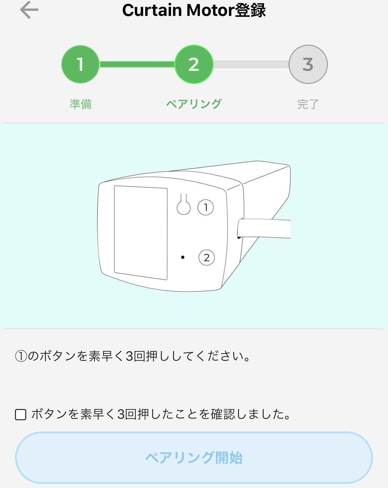 - 本体背面の①ボタンを素早く3回連続で押して②のLEDが早点滅に変わったことを確認し、下記画面の「ボタンを素早く3回押したことを確認しました。」チェックボックスを選択してチェックを入れて「ペアリング開始」ボタンをタップします。