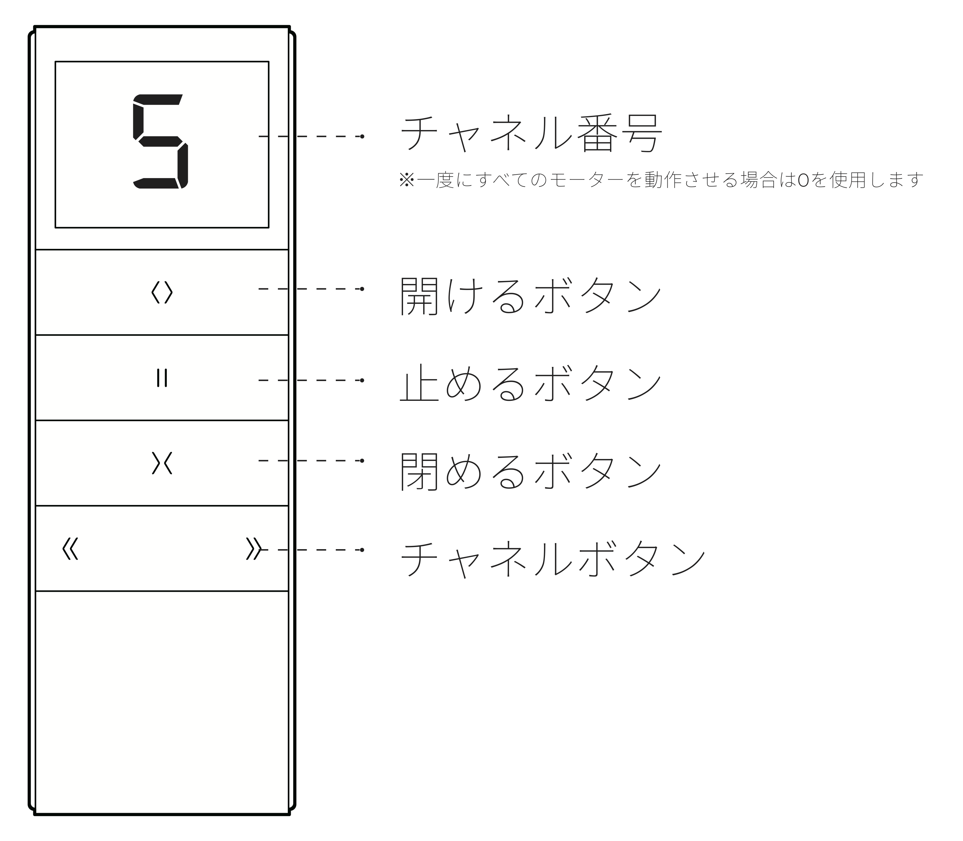 - <チャンネルボタン>*を操作しペアリングしたい番号を選択します。(0番は、カーテンデバイスが複数設定されている場合に、一括で開閉操作するためのチャンネルとなりますので、ペアリング時は使用しません)