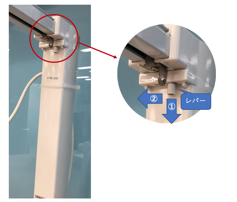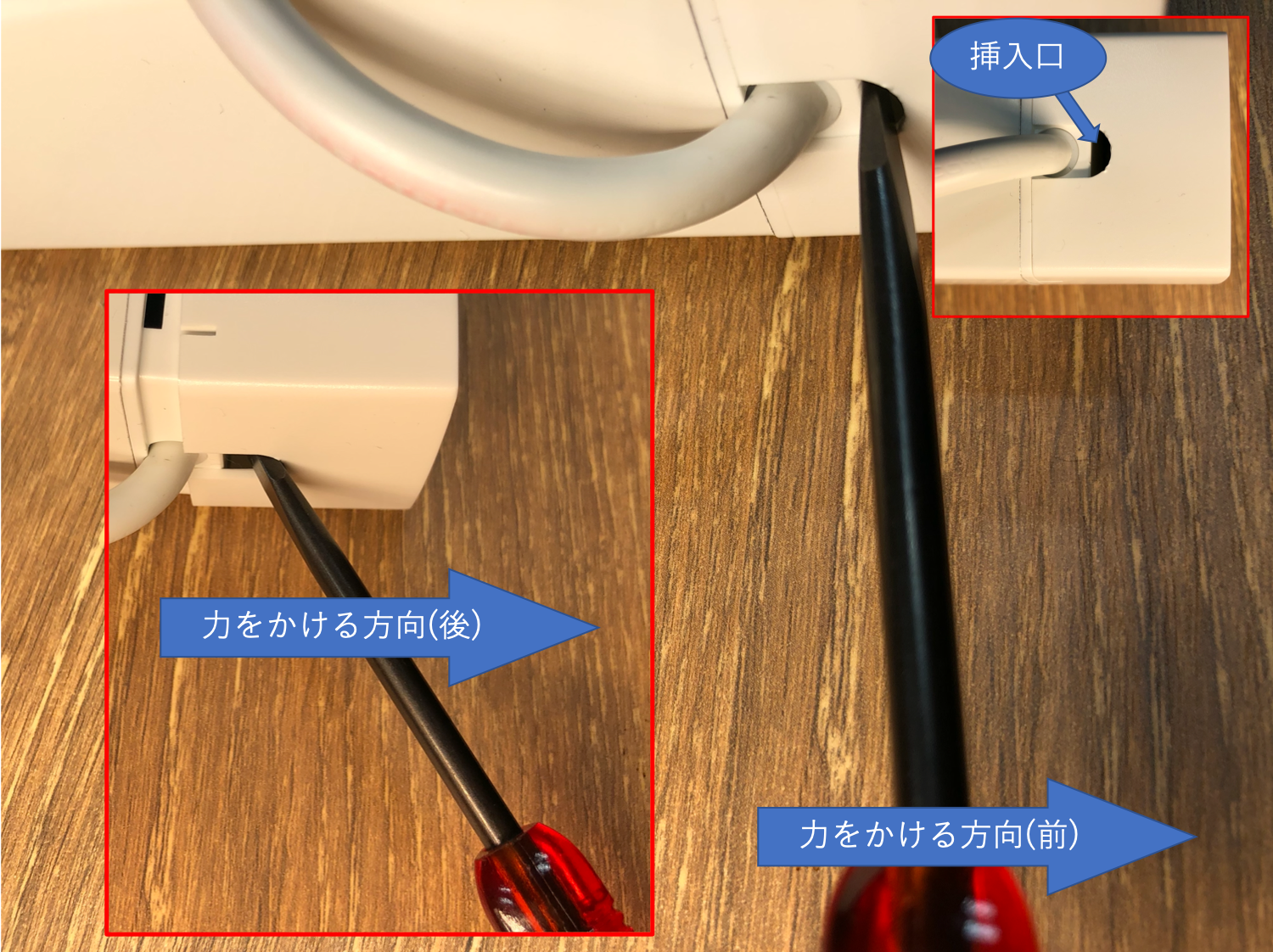 レバーを①の方向に引いてから②の方向にスライドするとデバイス本体が外れるようになりますので、レールから引き抜いて外します。その時デバイス本体の落下に注意してください。 - カバーを開ける際には、マイナスドライバー等を挿入口に入れ、図のように力をかけることで外すことができます。(カバー内に、デバイス本体とカバーをつなぐ配線等が入っていますので、カバーをひっぱりすぎないよう、お気をつけください)