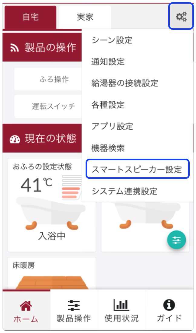 ①「どこでもリンナイアプリ」にて給湯器リモコンを登録後、ホーム画面右上の[設定(歯車)]をタップし、[スマートスピーカー設定]をタップします。