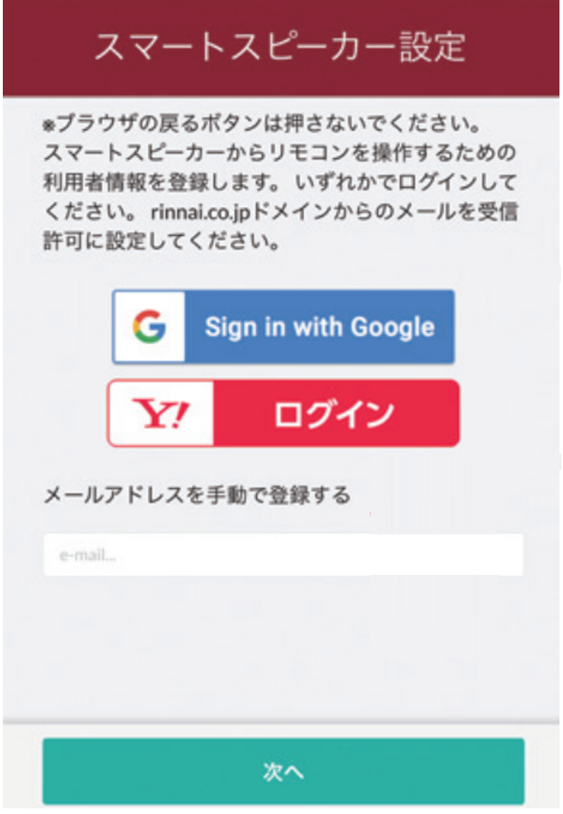 ②画面に沿って、リンナイ給湯器リモコンをスマートスピーカーから操作するための利用者情報登録を行ってください。