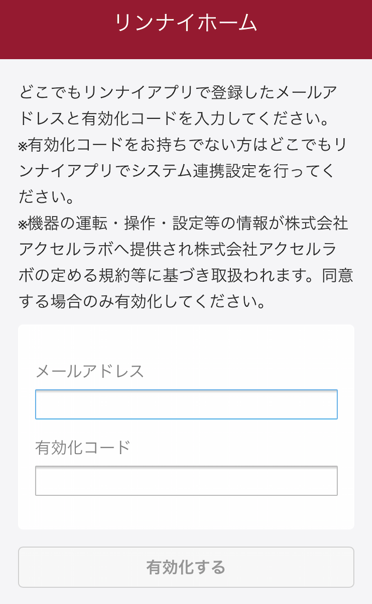 ⑥端末既定ブラウザで「リンナイホーム」画面が表示されますので、さきほど手順③で発行された、メールアドレスと有効化コードを入力し、[有効化する]をタップします。