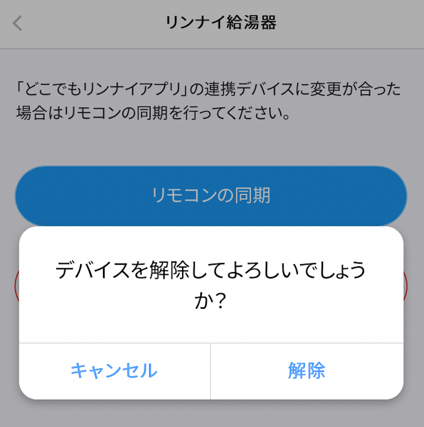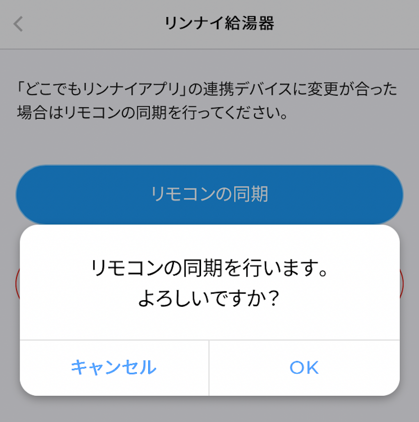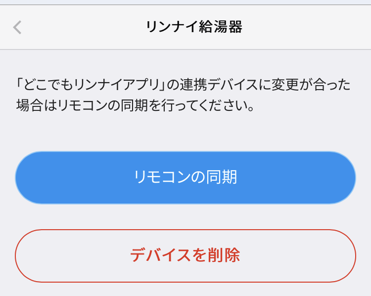 すでに一度、連携手順にて給湯器連携をさせた後に、「どこでもリンナイアプリ」でデバイス名を変更した場合や、「どこでもリンナイアプリ」で操作対象となるお風呂・床暖房を増設された場合、SpaceCoreアプリにて、以下手順にて「リモコン同期」を行ってください(リモコン同期を行わないままですと、SpaceCoreからのデバイス操作が行えません)。