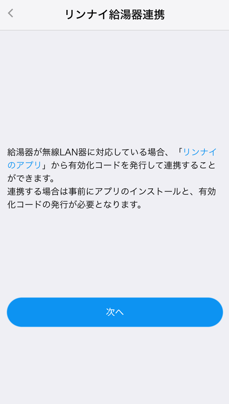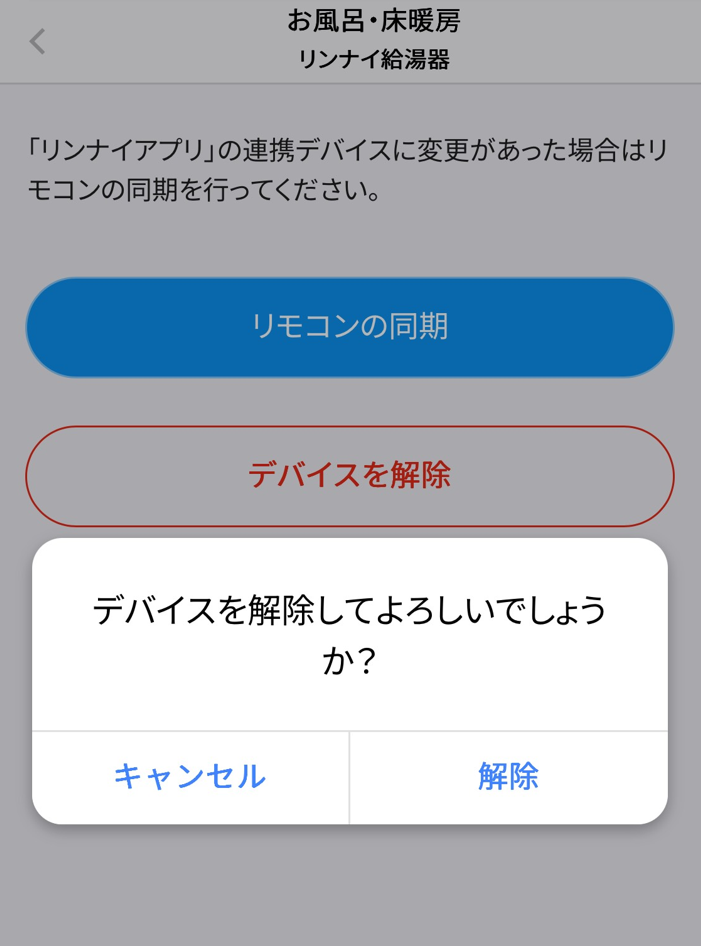 「どこでもリンナイアプリ」との連携を解除した場合は、「リンナイアプリ」で、お使いの給湯器の設定を実施してから、SpaceCoreアプリでの連携手順を実施ください。