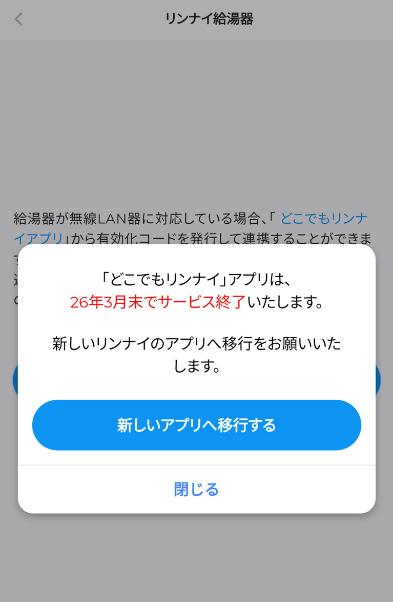 ⑤「どこでもリンナイ」アプリサービス終了のお知らせが表示されますので、「新しいアプリへ移行する」をタップします。