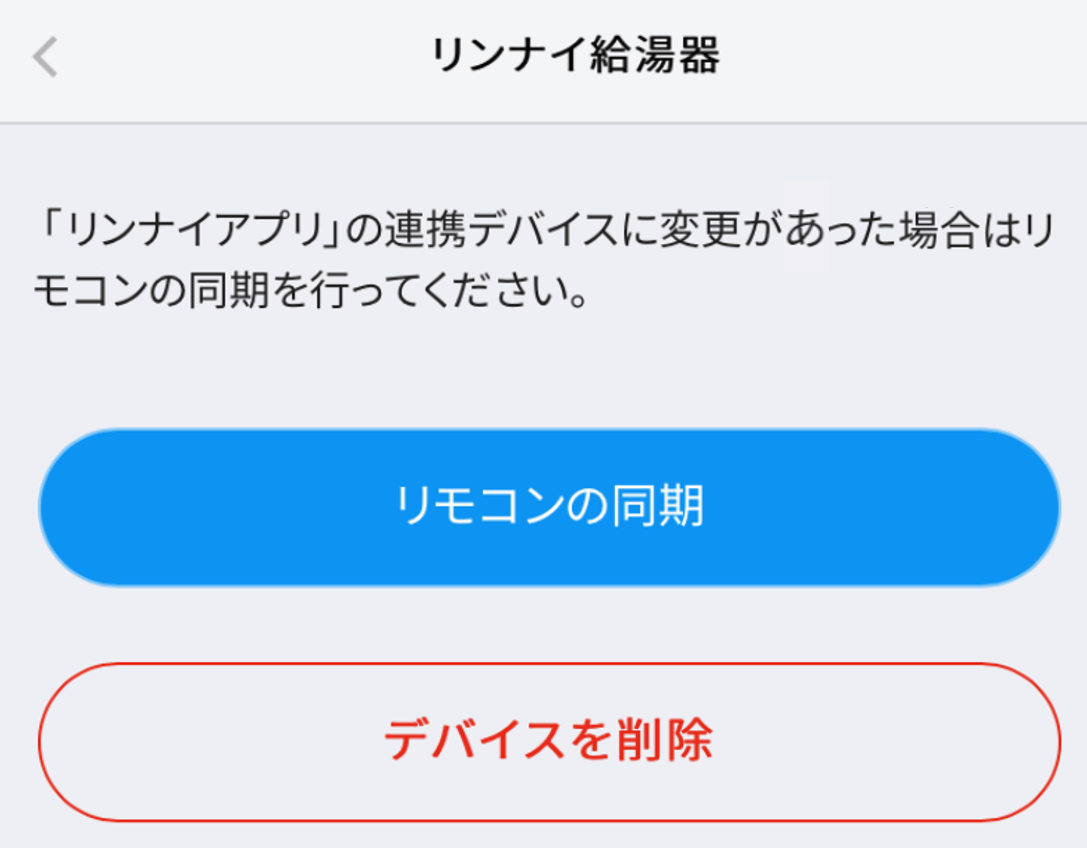 すでに一度、連携手順にて給湯器連携をさせた後に、「リンナイアプリ」でデバイス名を変更した場合や、「リンナイアプリ」で操作対象となるお風呂・床暖房を増設された場合、SpaceCoreアプリにて、以下手順にて「リモコン同期」を行ってください(リモコン同期を行わないままですと、SpaceCoreからのデバイス操作が行えません)。