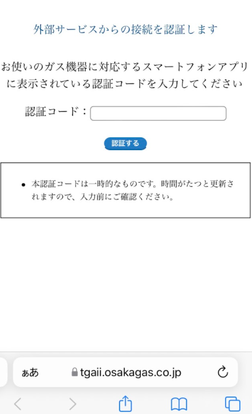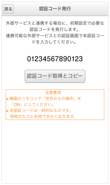 「あったかホッと給湯」アプリを起動し、[設定] > [その他情報] > [外部サービスとの連携] > [認証コード発行] をタップし、「認証コード取得とコピー」ボタンをタップします(認証コードが表示され、コピーされます)。