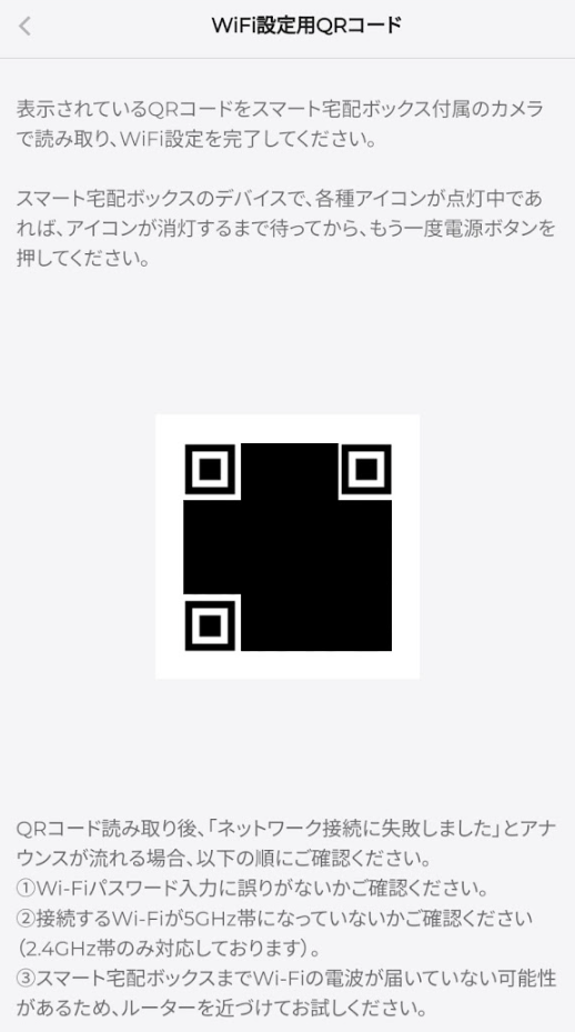 ※QRコードの読取りに失敗する場合、宅配ボックス(PacPort)の初期設定時にQRコードが読み取れず、設定完了できない(ファームウェアアップデート)をお試しください。