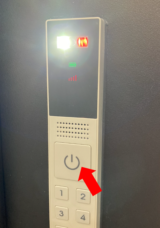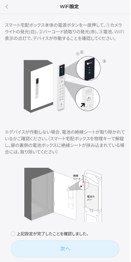 ※接続先のWi-Fiのパスワードは8桁以上である必要があります。7桁以下のパスワードが設定されている場合はエラーが表示されてQRコードの作成に失敗してしまいますので、パスワードを8桁以上に変更したうえで本操作を実施してください。⑤スマート宅配ボックス本体の[電源ボタン]を1度押してください。カメラのライトや、各種アイコンが点灯します。