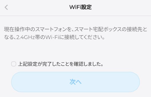 ②ご利用中のスマートフォンを、スマート宅配ボックスの接続先となる2.4Ghz帯のWi-Fiに接続し、チェックをいれて、[次へ] をタップします。