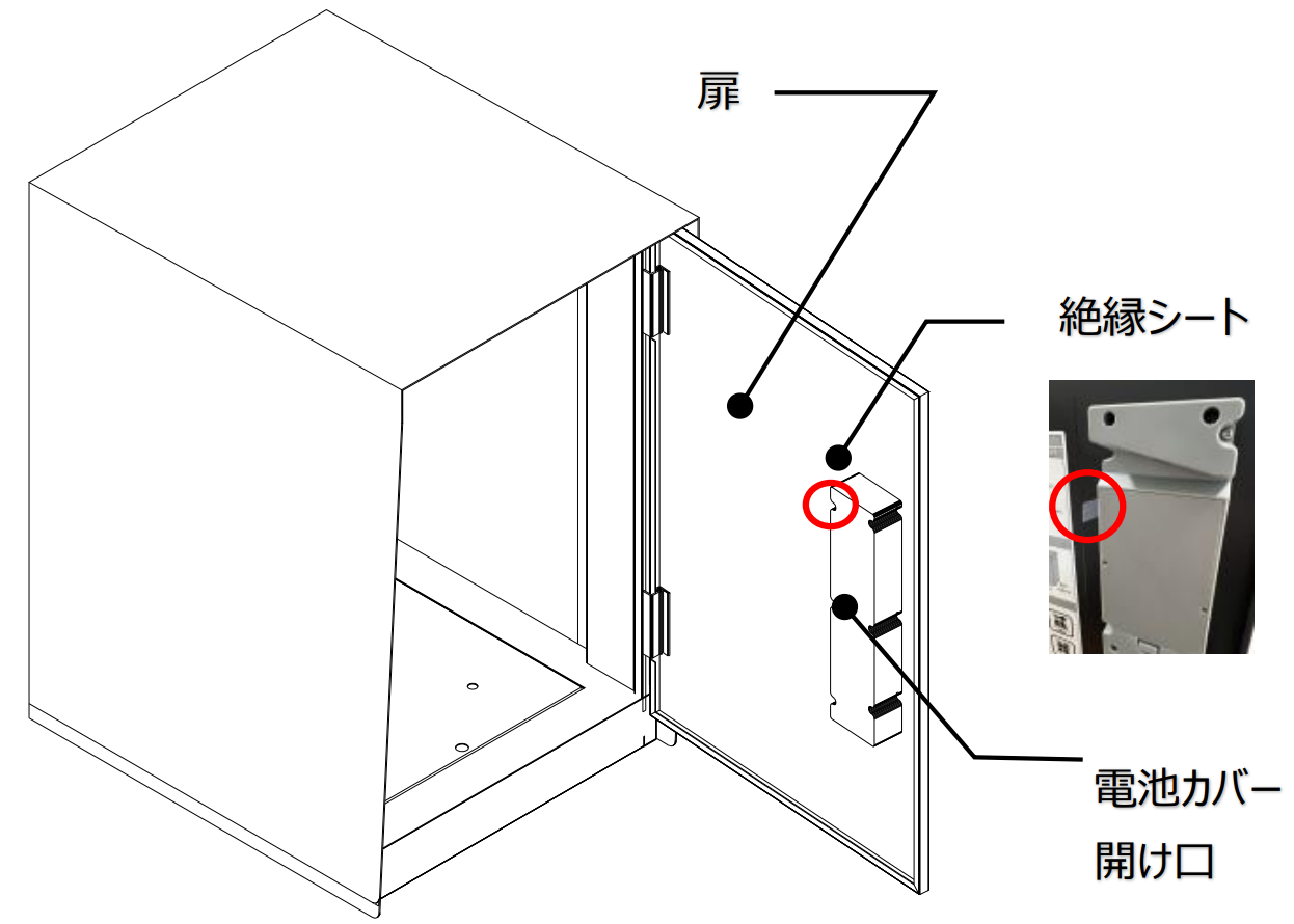 ・電源ボタンを押しても反応がない場合には、電池収納部に絶縁シートが挟まれている可能性がありますので、鍵で扉をあけて、以下の電池カバー部をご確認ください。