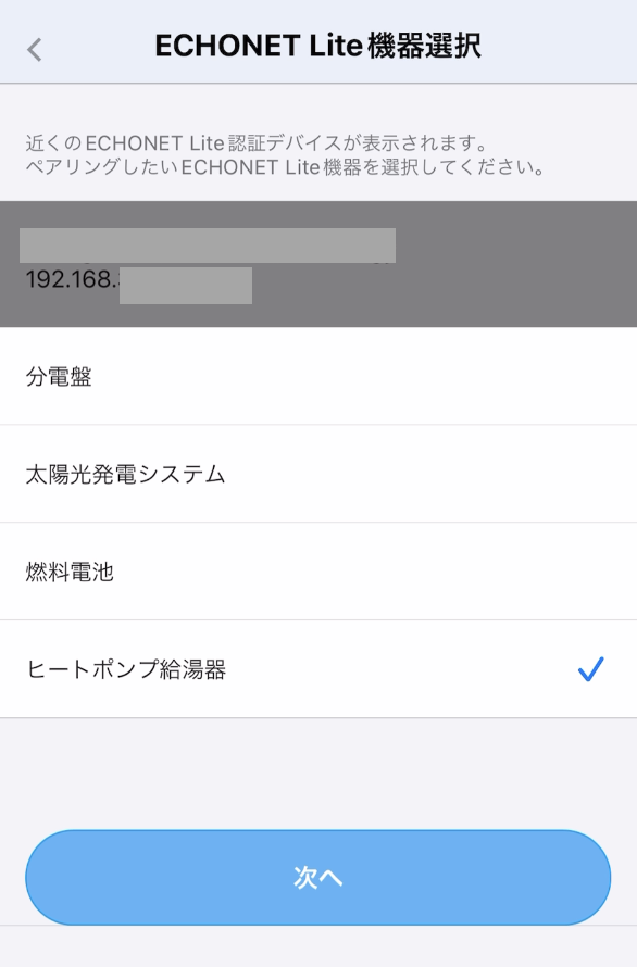 6. 近くのECHONET Lite認証デバイスが表示されます。ペアリングしたいデバイスをタップすると、チェックが付きますので、「次へ」をタップしてください。