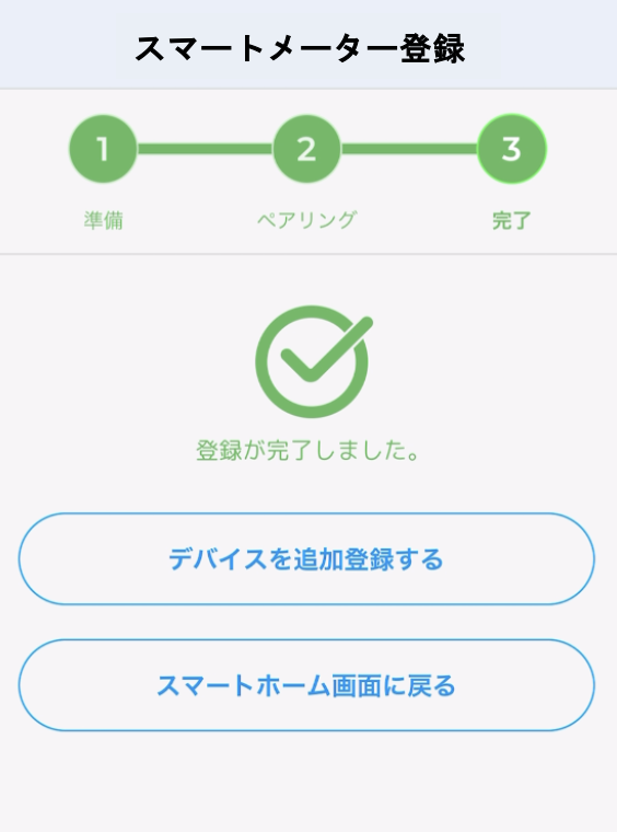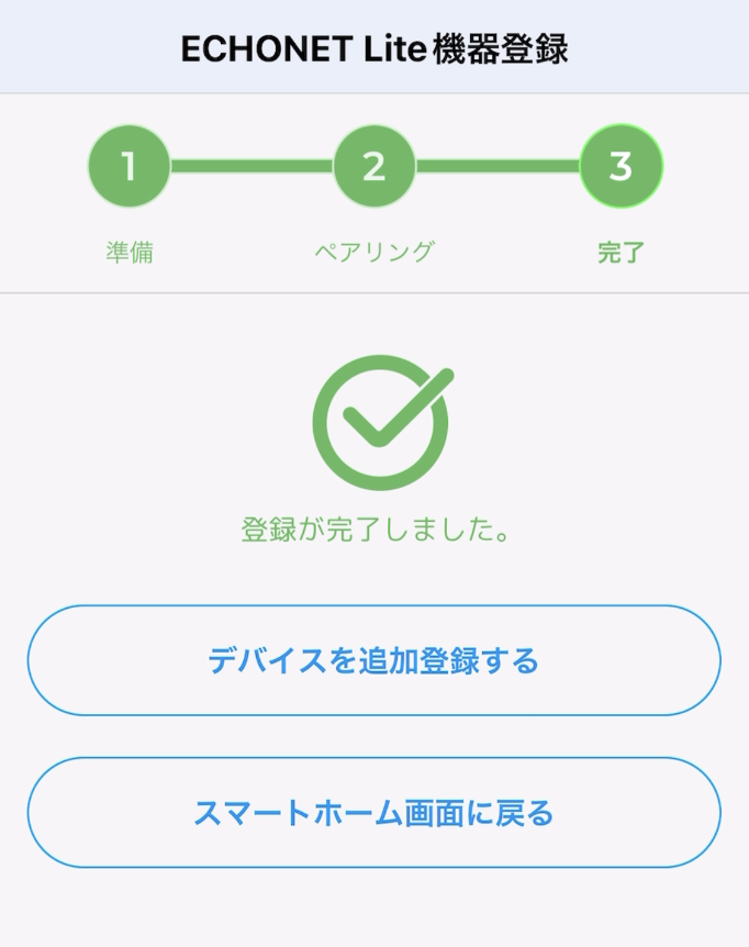「スマートホーム画面に戻る」をタップし、引き続き、 ECHNET Lite認証機器または、 スマートメーター を登録していく登録してください。