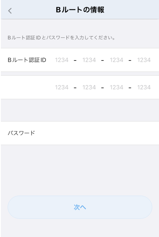 6. あらかじめ取得している、「BルートサービスID」および「Bルートパスワード」を入力し後、「次へ」をタップしてください。