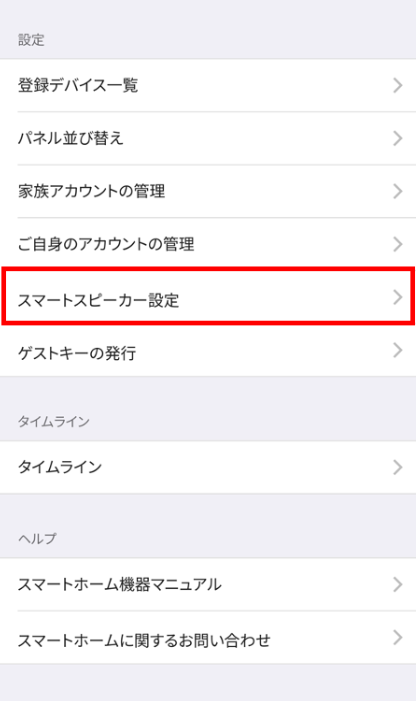 ②スマートホームメニューの下方より、[スマートスピーカー設定]をタップしてください。
