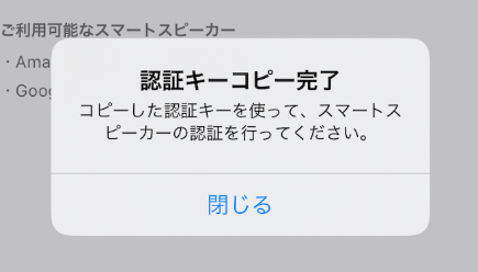 ③赤枠部に認証キー(以下は表示例です)が表示されますので、タップししてください。認証キーがコピーされます。(認証キーをコピー後、alexaへのスキル連携は1時間以内に実施ください)