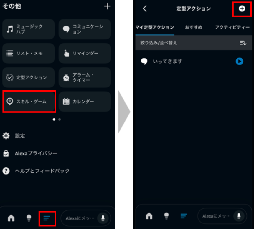 alexaアプリ「その他」タブより、定型アクション > 「+」 をタップします。