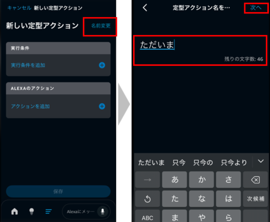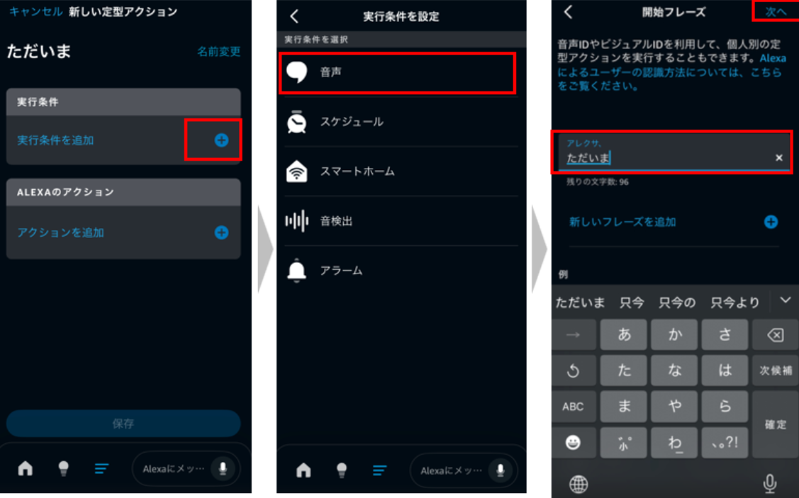 3. 実行条件を入力します。この例図では、「アレクサ、ただいま」と声をかけて、ただいまシーンを動かすために、実行条件で「音声」、開始フレーズに「ただいま」を入力し、画面右上「次へ」をタップします。
