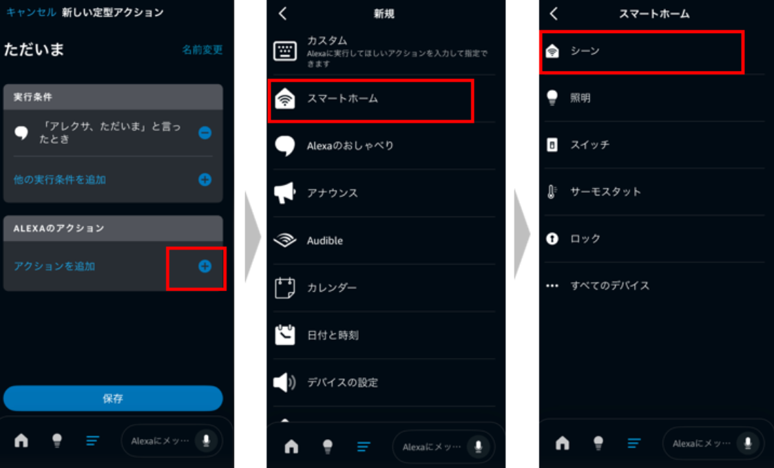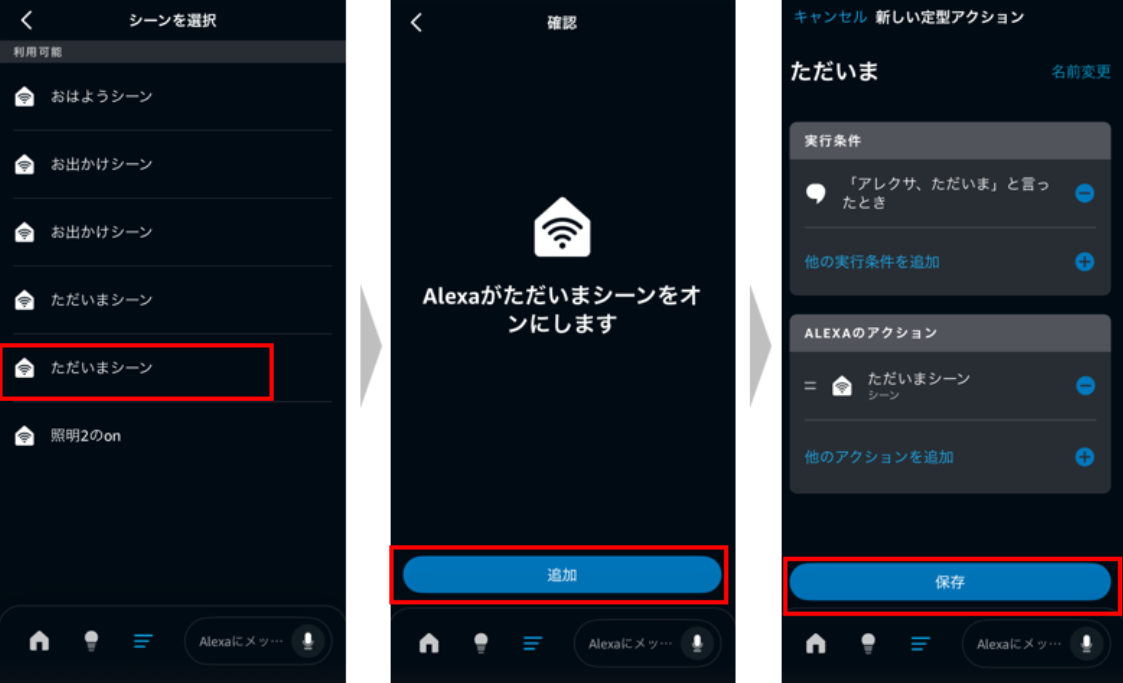 5. 実行させたいシーンを選択し、「追加」タップ、最後に「保存」をタップします。設定が完了したら、alexaアプリのホームタブを開き、設定した声掛けコマンドで、シーンが実行されるかどうか、お試しください。