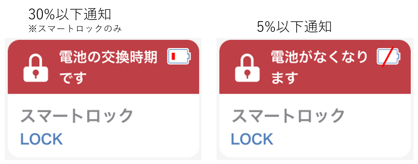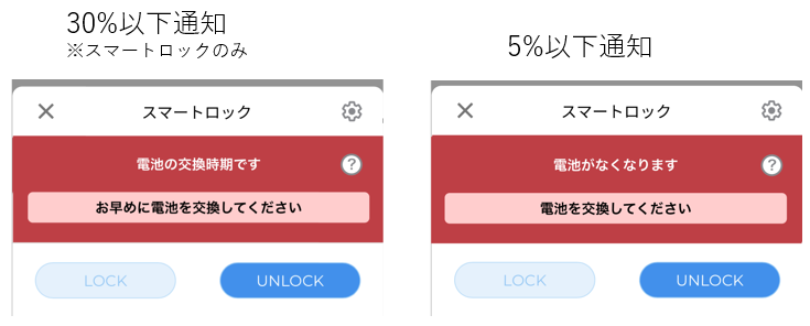スマートロックのみ、電池残量が30%以下・5%以下の2回のタイミングでお知らせし、その他のデバイスは5%以下になったタイミングでお知らせします。