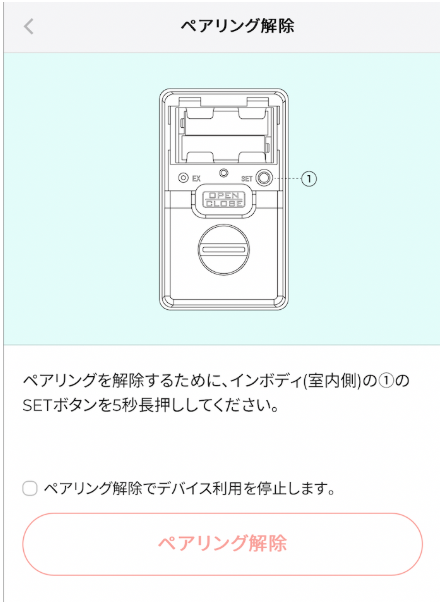 アプリで「ペアリング解除でデバイス利用を停止します」にチェックを入れ、「ペアリング解除」をタップした直後に、デバイスの「SET」ボタンを、「ピピっと」音がなるまで長押し(約5秒間)してください。