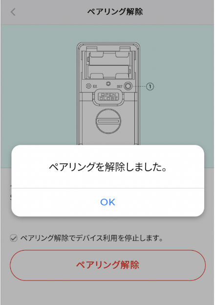 8. 「ペアリングを解除しました」のポップアップが表示されましたら、完了です。OKをタップします。