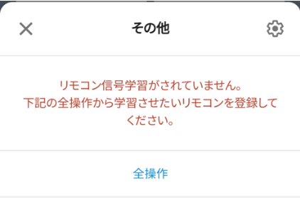 対象のパネルをタップすると、「リモコン信号学習がされていません。下記の全操作から学習させたいリモコンを登録してください。」というダイヤログが表示されます。