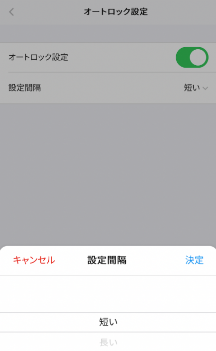 ※設定間隔で「短い」を選択すると15秒後に、「長い」を選択すると30秒後に施錠されます。