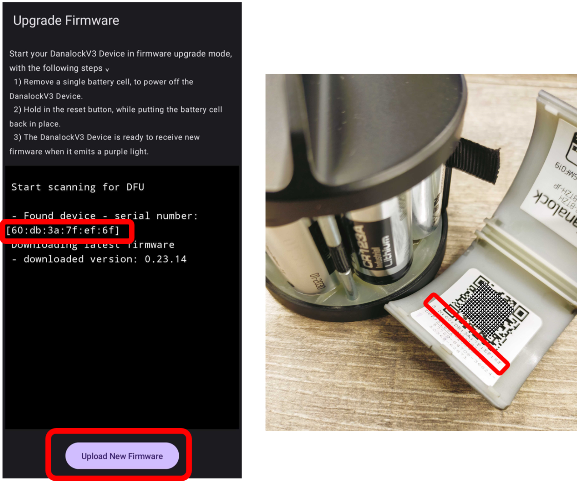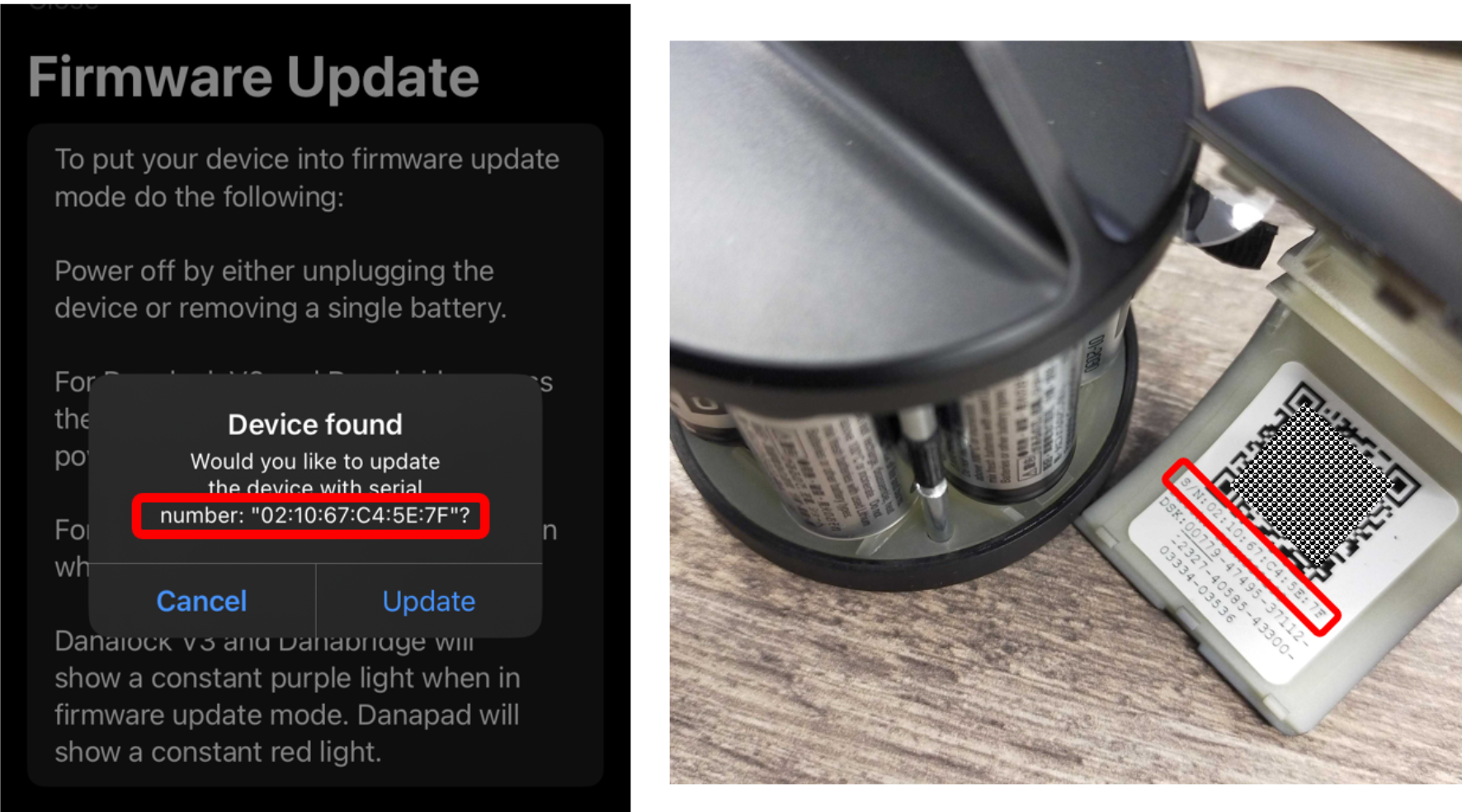 ファームウェア更新するDanalockの電池の蓋を開け、蓋裏のQRコード下部に記載のDanalockシリアルナンバーと一致していることを確認してください。