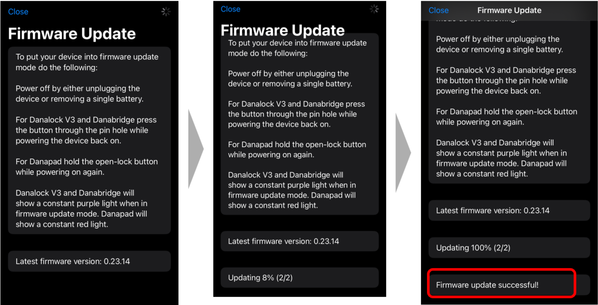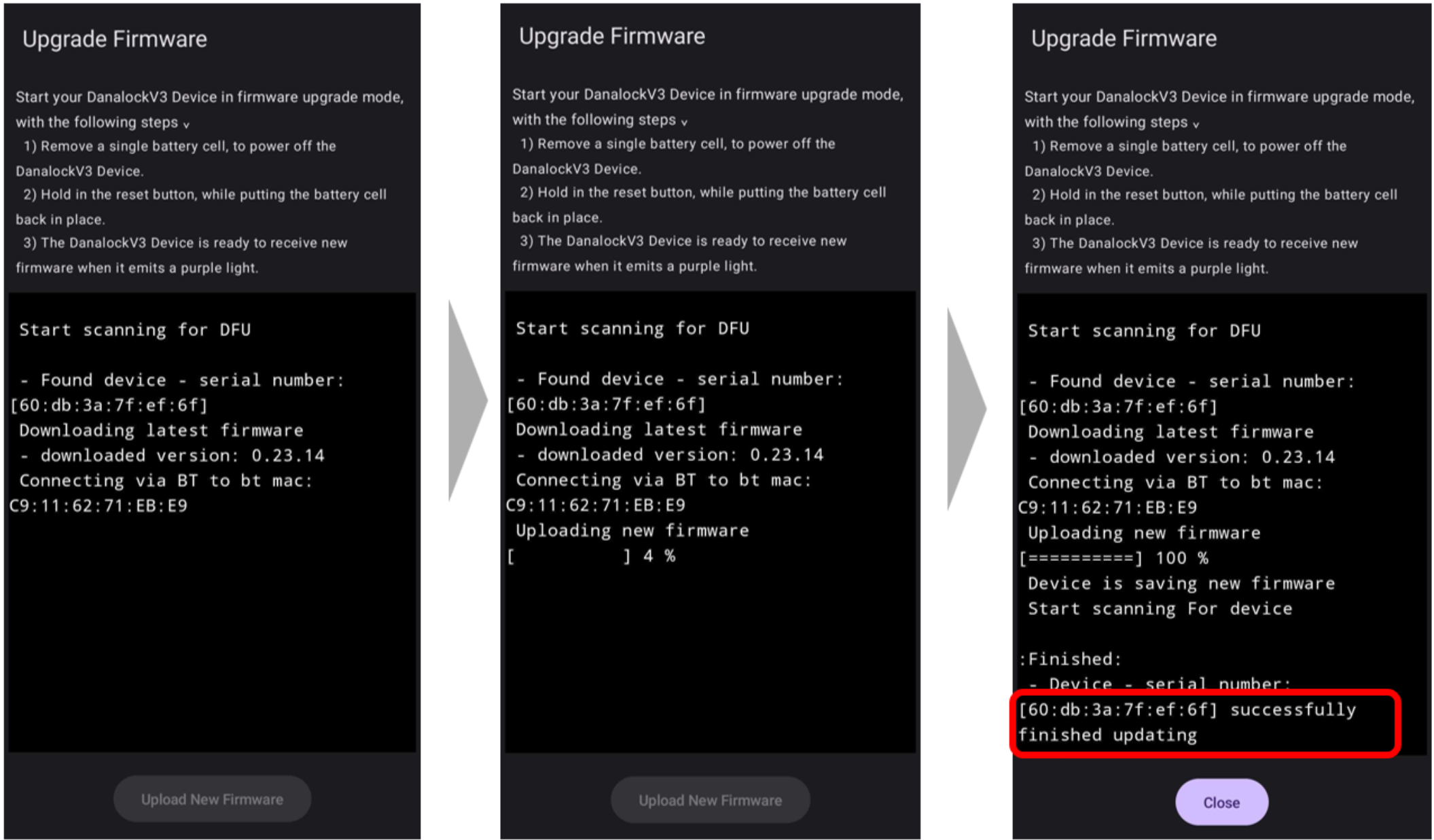 5. ファームウェア更新が開始されます(この間、DanalockのLEDは青色点灯状態になります)。100%まで達し、” Firmware update successful! ”が表示されたら、更新完了です(DanalockのLEDは消灯します)。