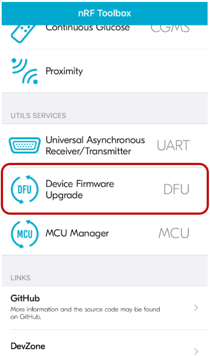 3. アプリを起動し、カーソルを下げ、「Device Firmware Upgrade」をタップします。