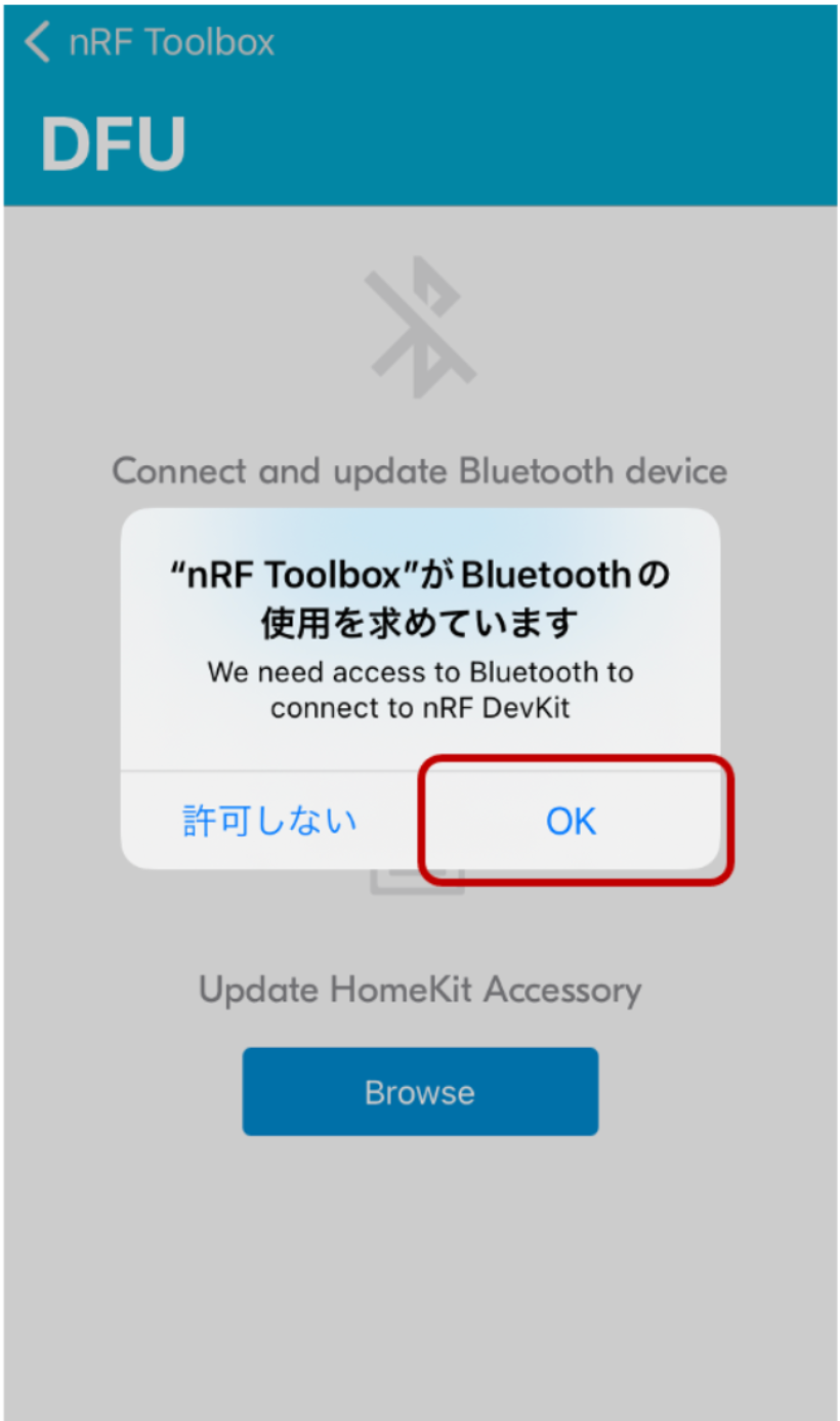 4. 「”nRF Toolbox”がBluetoothの使用を求めています」のポップアップが表示されたら「OK」をタップします。
