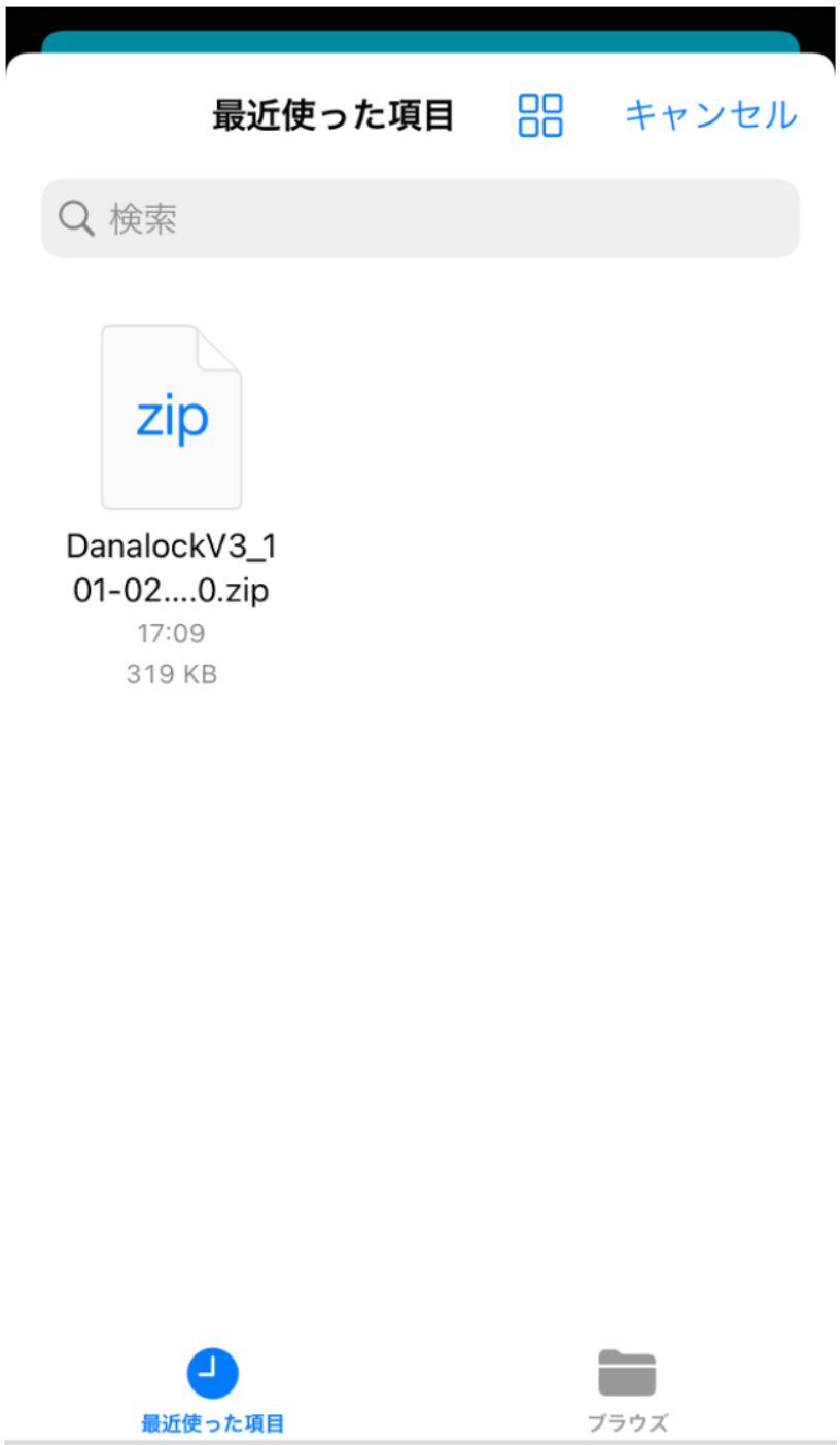 8. 「ファイル」アプリが開き、先ほど①でダウンロードした「DanalockV3...」というzipファイルが表示されますので、このファイルをタップします。