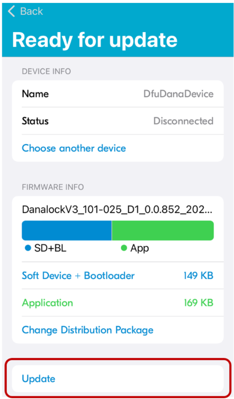 シリアル一致を確認したら、アプリの「Update」をタップします。