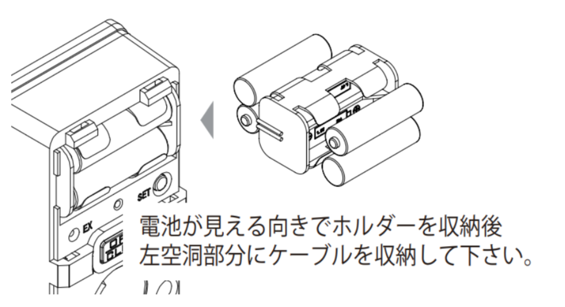 電池を挿入すると、約5秒後にピッと音がなります。音が鳴ったら、電池ボックスに収納し、電池カバーを取り付けます。音が鳴らなかった場合は、一度電池を取り外してから再度挿入し、音がなることを確認してください。