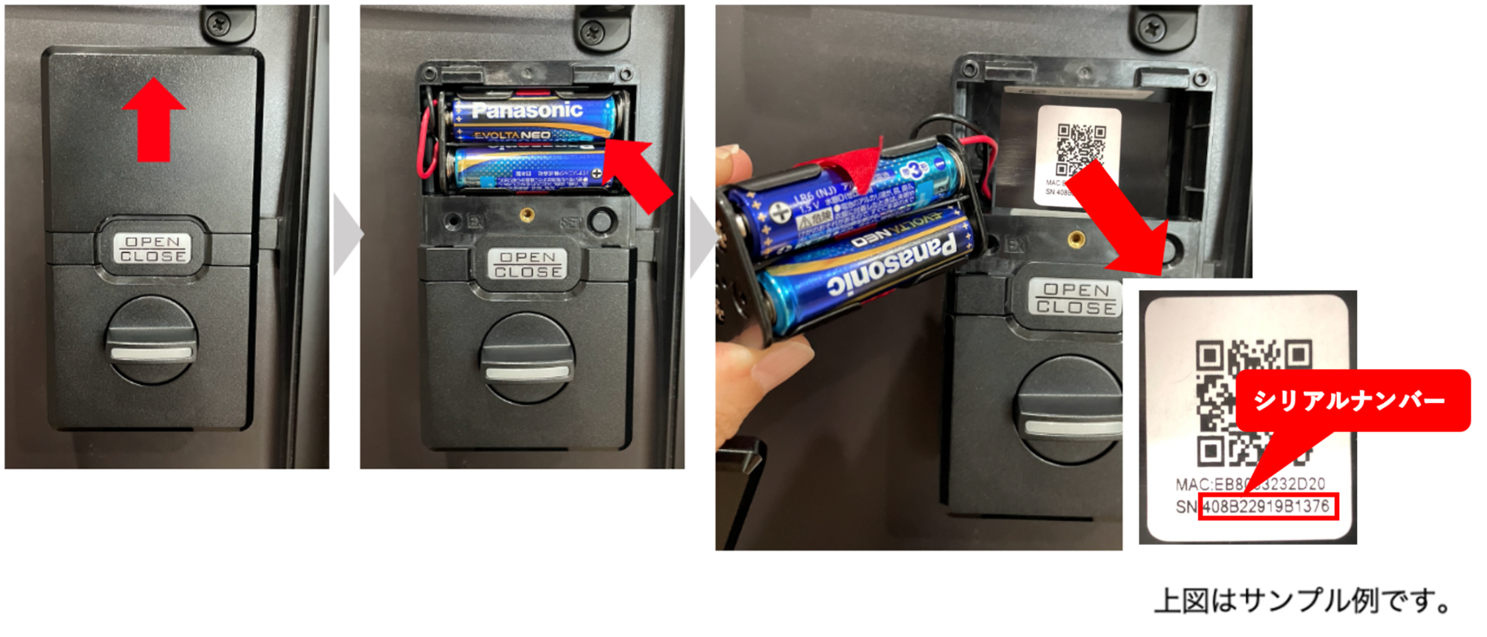 点灯パターン 説明 インボディ O/Cボタン 青 解錠時 インボディ O/Cボタン 赤 施錠時 インボディ O/Cボタン 紫 マグネットセンサー感知時 アウトボディ 認証LED 緑 解錠、認証成功時 アウトボディ 誤認証LED 赤 施錠時、認証失敗時 アウトボディ LowバッテリーLED 赤 Lowバッテリー(電池交換 してください) シリアルナンバーの確認方法