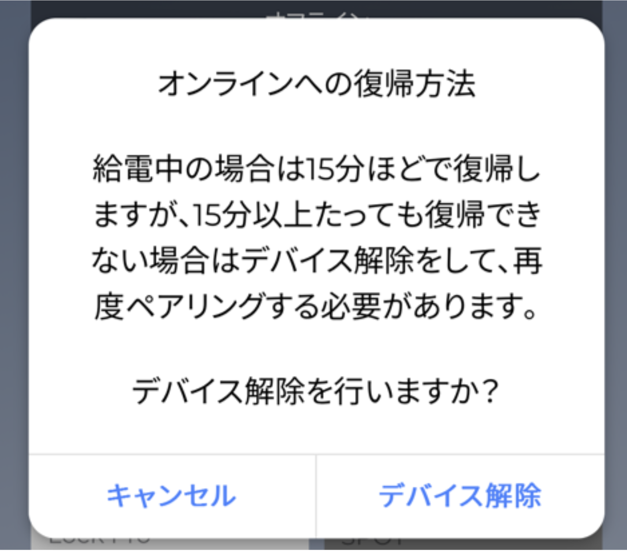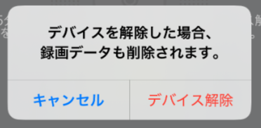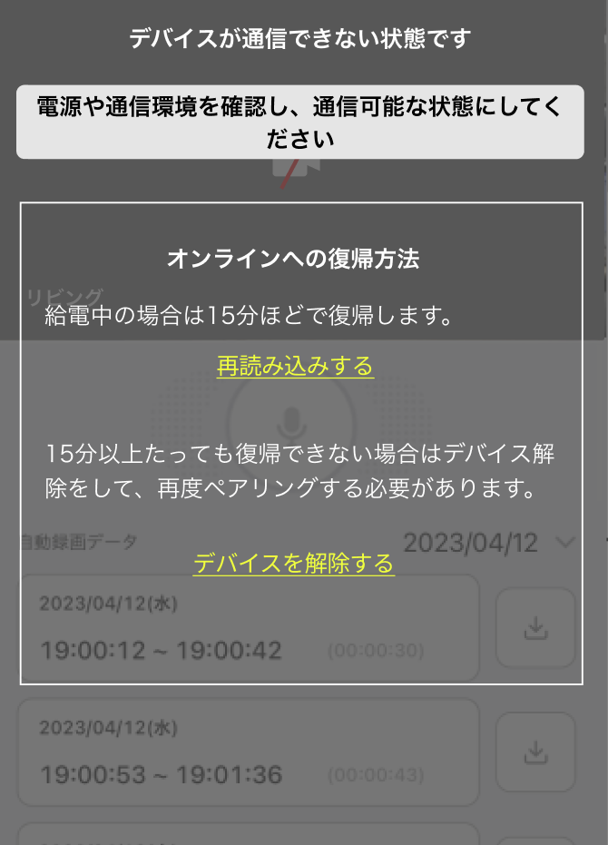 「再読み込みする」をタップしてもオンラインへ復帰せず、給電開始から15分以上経過してもカメラがオンラインになっていない場合は、「デバイスを解除する」をタップします。③確認ダイアログが表示されるので「デバイス解除」をタップします。