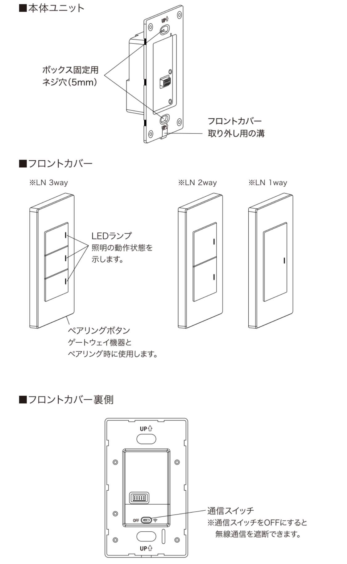 1ボタンタイプ:LN 1 way 、2ボタンタイプ:LN 2 way 、3ボタンタイプ:LN 3 way各部名称