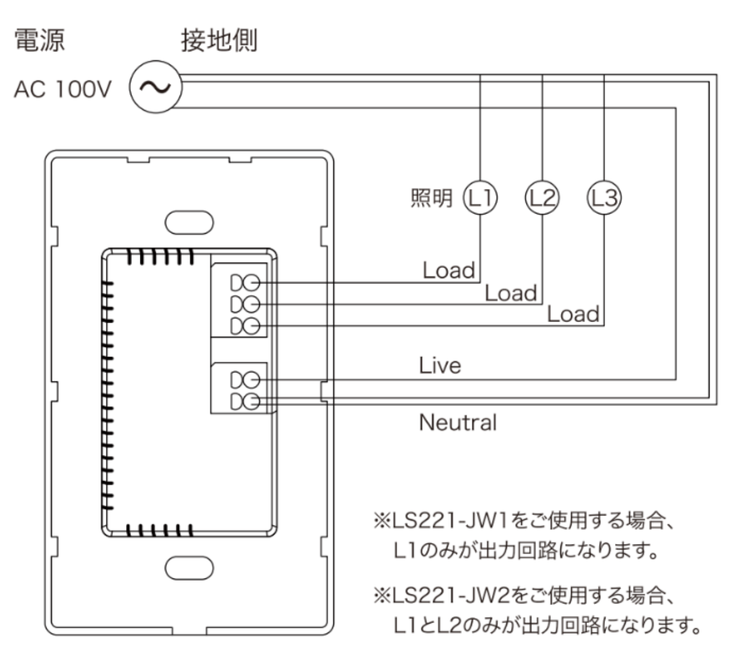 ①片切スイッチ施工配線、および、接地側線(Neutral)が必要です。