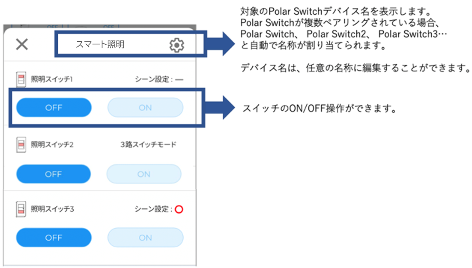 設定完了後、Polar Switchデバイス本体の双方で、照明ON/OFFできることをご確認ください。