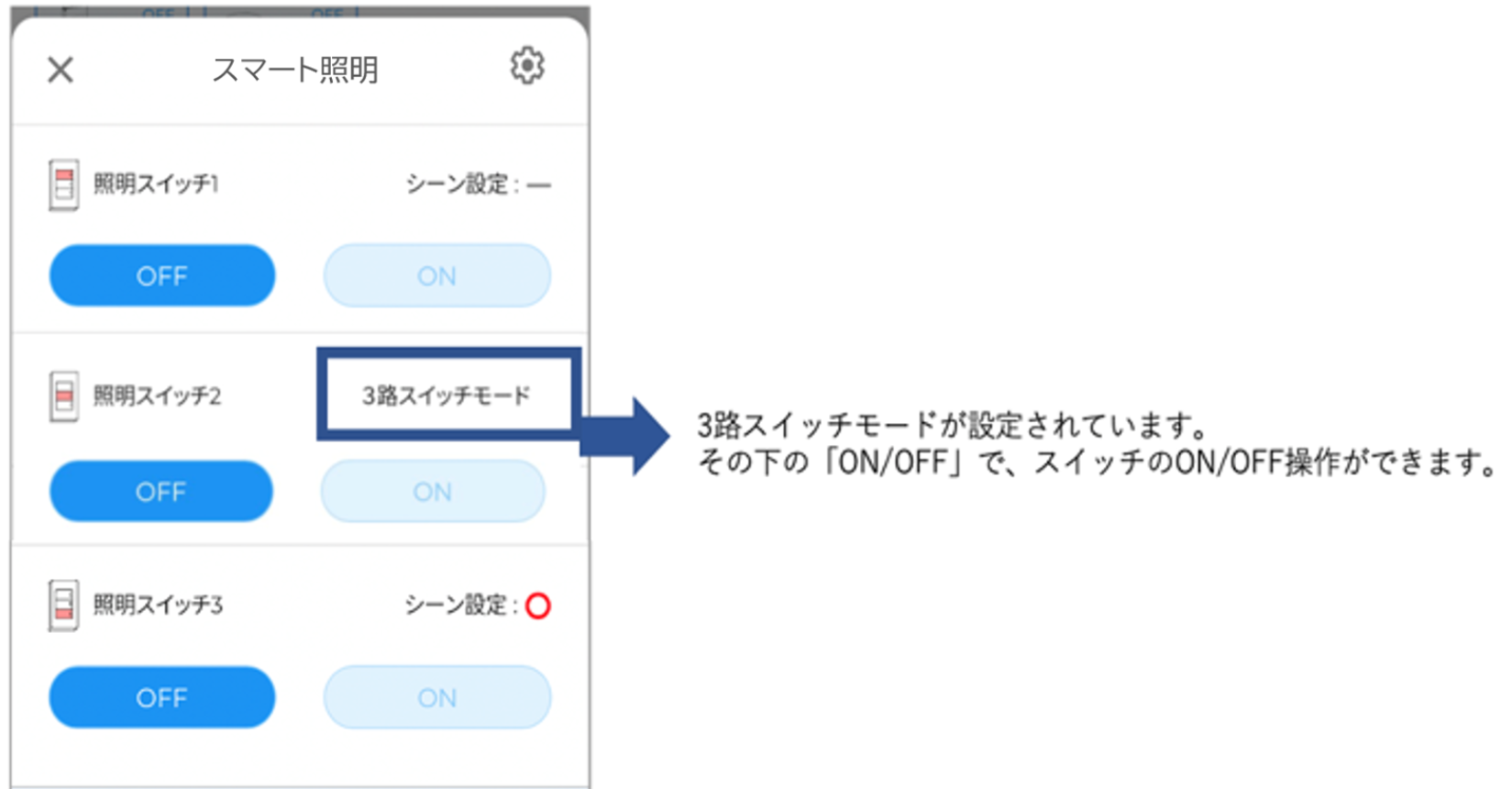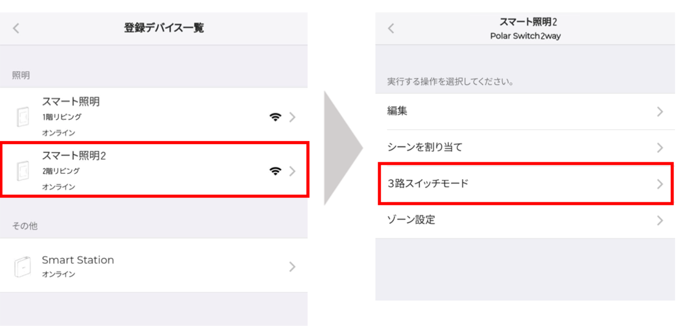 スマートホーム画面>右上[MENU]>登録デバイス一覧 > 「スマート照明2」 > 3路スイッチモード