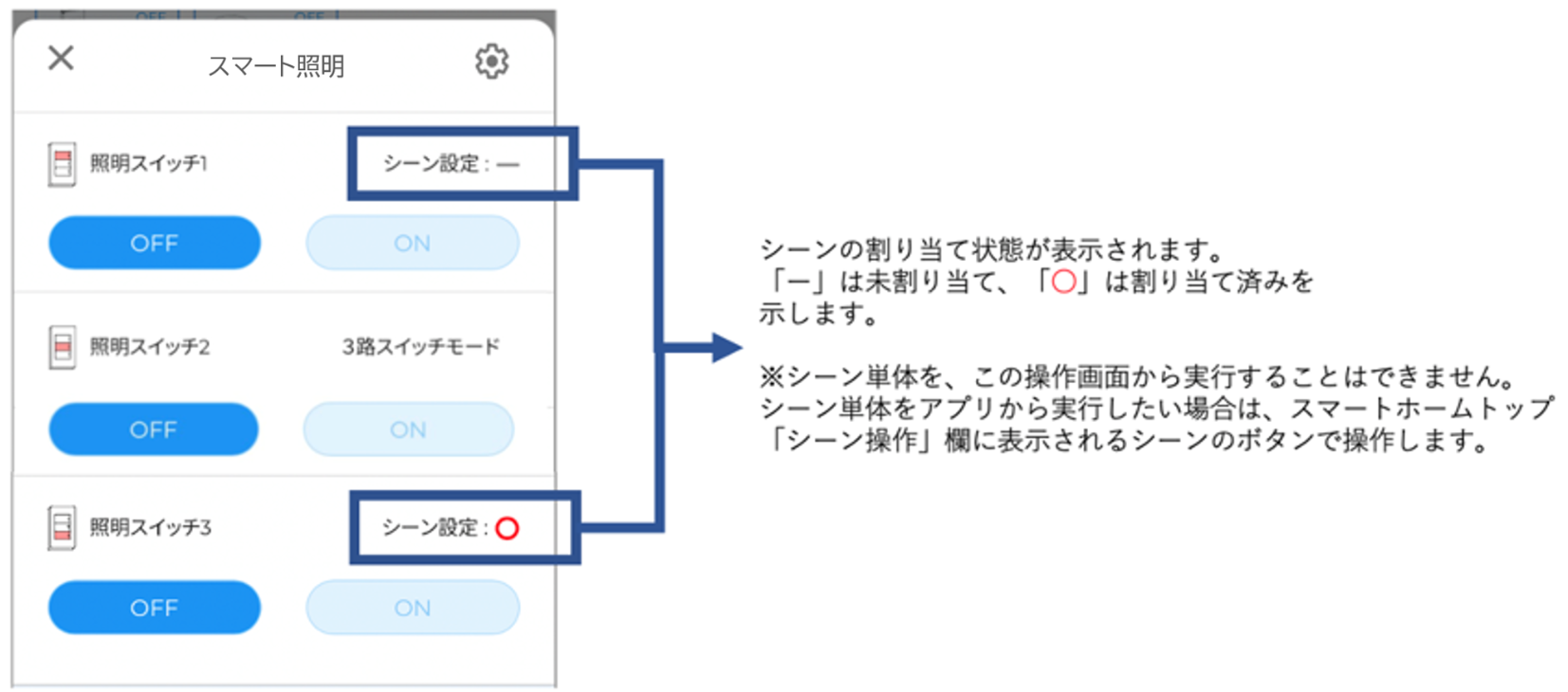 また、一つのスイッチのON/OFF操作、それぞれに対して、複数のシーンを割り当てることで、一度のスイッチ操作で、登録したすべてのシーンを一気に作動することができます。