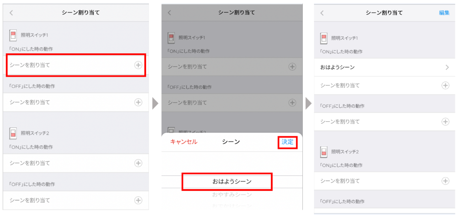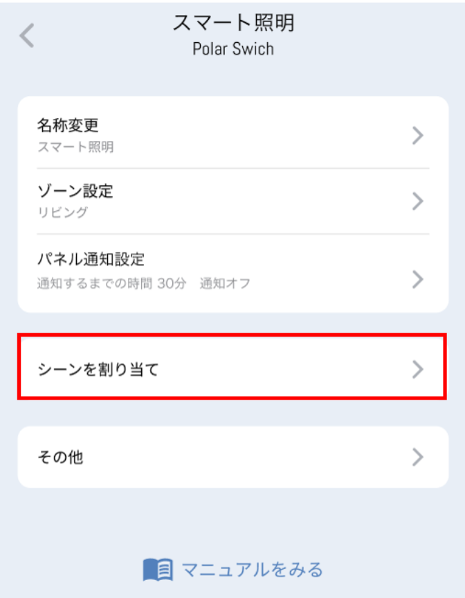 ③シーン割り当て をタップします。たとえば、2ボタンタイプのPolar Switch 上側スイッチを「ON」にした際に、「おはようシーン」を作動させたい場合には、以下のように設定します。