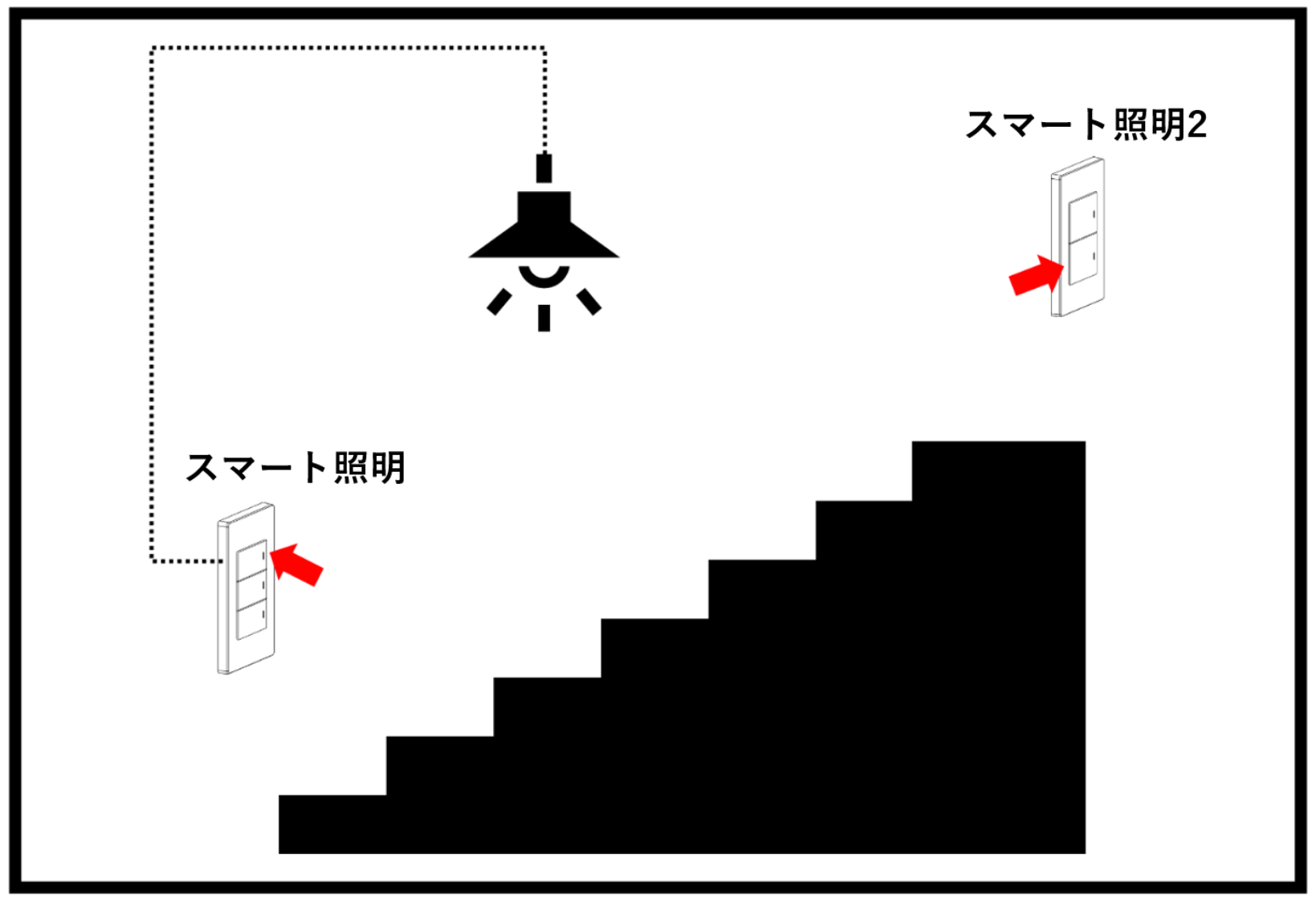 例えば、下図のように、階段に取り付けられた照明を、1階スイッチからも2階スイッチからもON/OFF操作ができるようにしたい場合に、本設定を実施します。上図では、「スマート照明」(1階スイッチ)が照明と配線されています。階段照明を、「スマート照明」(1階のスイッチデバイス)の一番上のスイッチと、「スマート照明2」(2階のスイッチデバイス)の下方スイッチの双方で、照明操作できるようにするための手順を解説いたします。