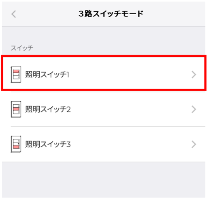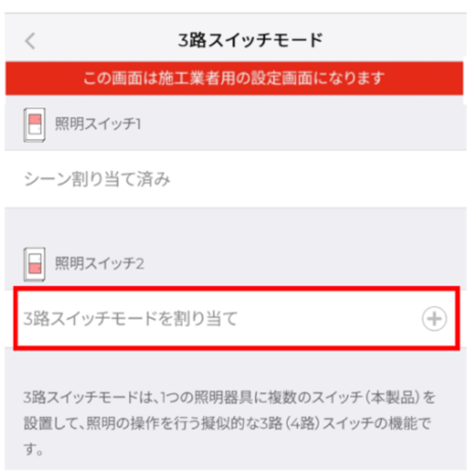 ※すでに、他のスイッチにて3路スイッチモード割当済みの場合や、シーン割当済みの場合は選択できません。選択可能なスイッチは、項目右に「+」が表示されているスイッチになります。