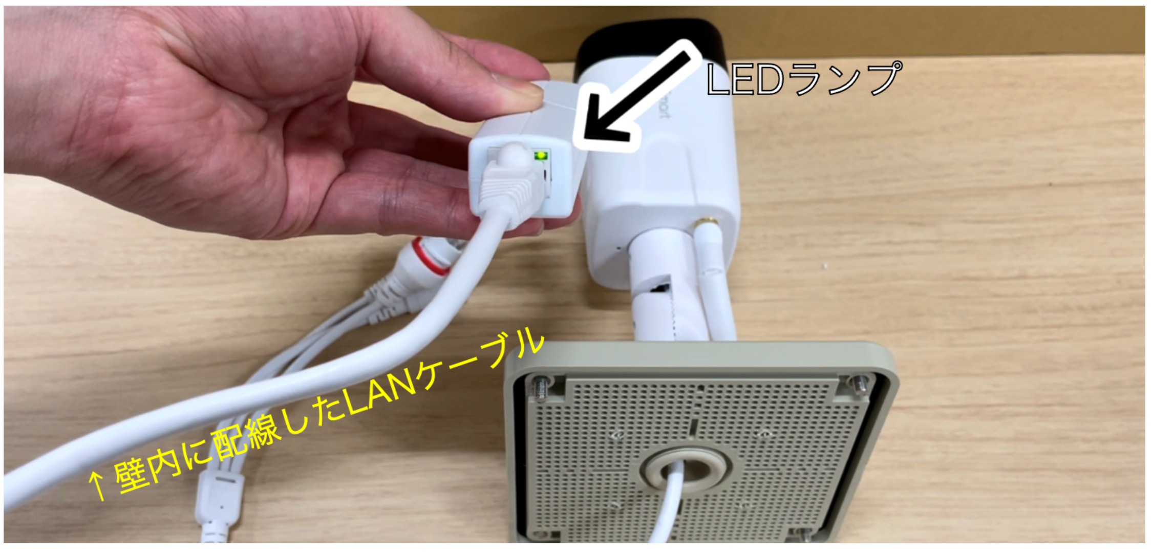 カメラ本体のLANポートにLANケーブルを直接結線します。本体通電時、レンズ横のLEDが約5秒間発光します。