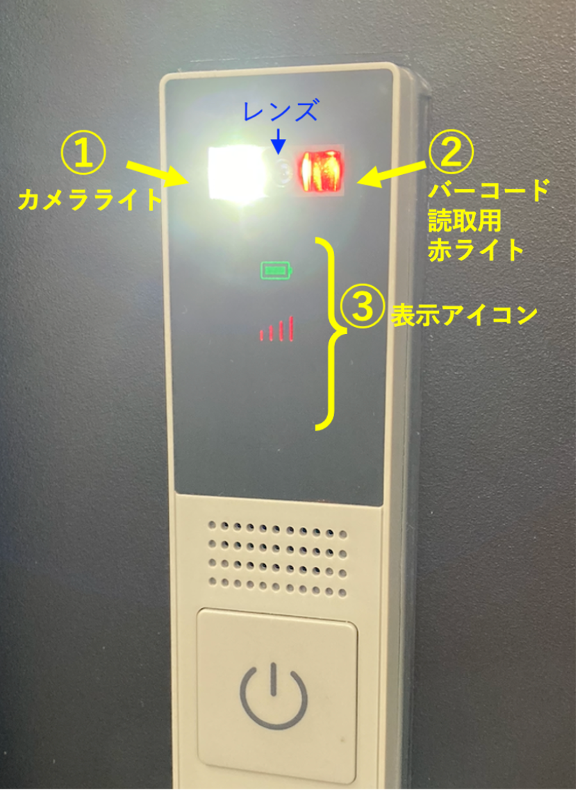 電源ボタンを押すと、下図③アイコンは点灯するが、①カメラライトや、②バーコード読取赤ライトが点灯せず、アプリに表示されたQRコードが読み込めない