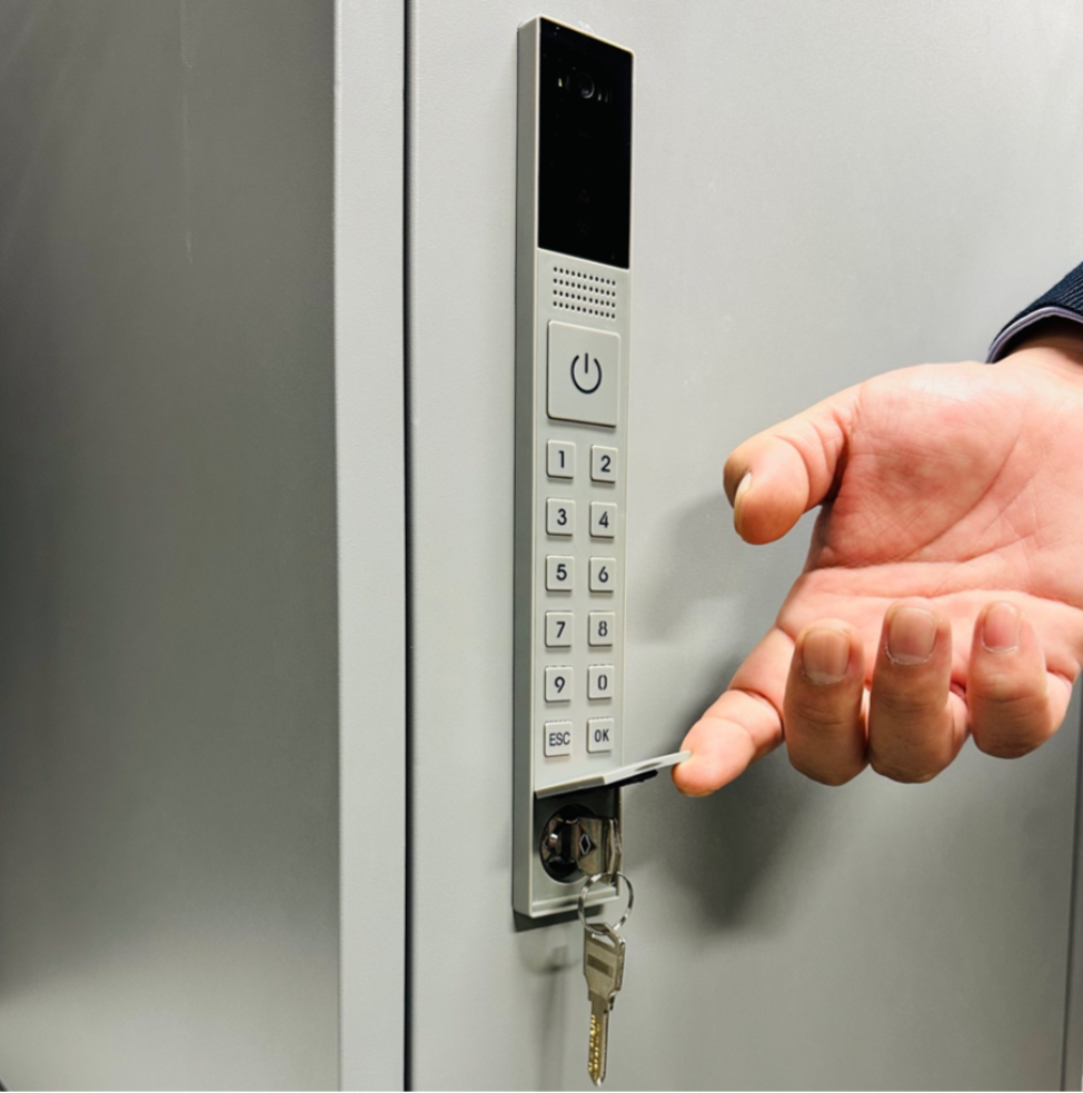 2. スマートロック下部の蓋を開けて、物理鍵を挿して解錠します。